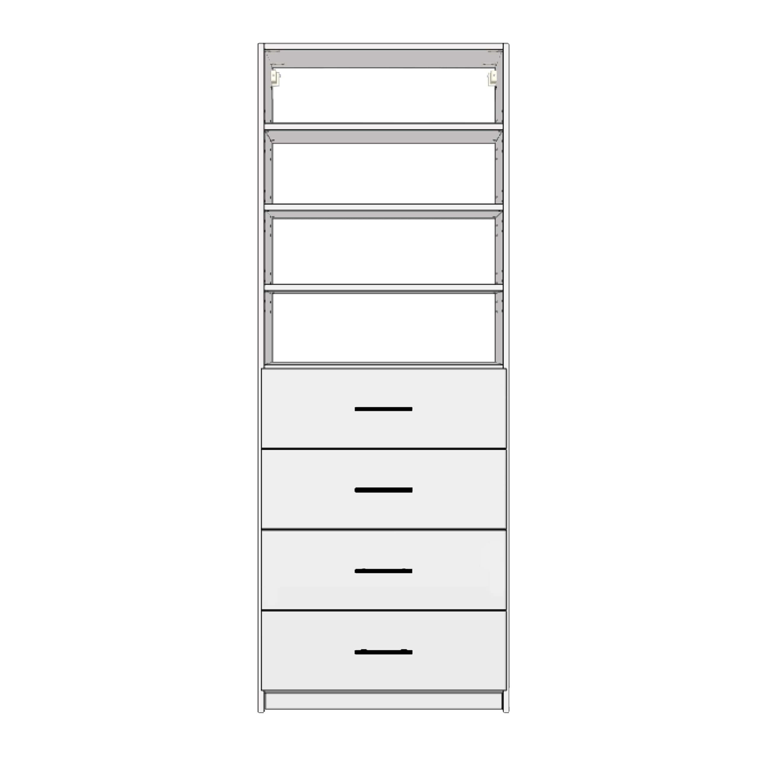 The classic multi-purpose shelving unit. It includes 3 adjustable shelves above 4 soft close drawers below. Hight is 84"